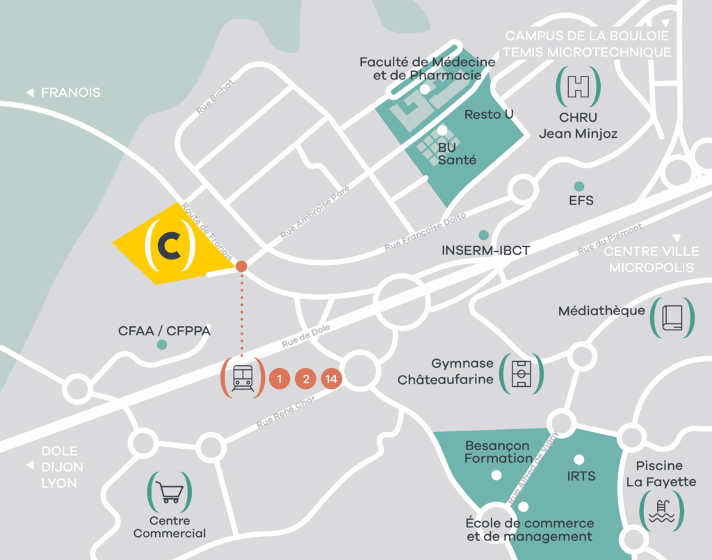 La résidence pour étudiants (capétudes) Besançon bénéficie d’une situation privilégiée dans le quartier des Hauts du Chazal, à proximité immédiate de la Faculté de Médecine et de Pharmacie. L’emplacement est idéal et proche de toutes commodités, du restaurant universitaire, de la bibliothèque et des transports en commun (bus et tramway).